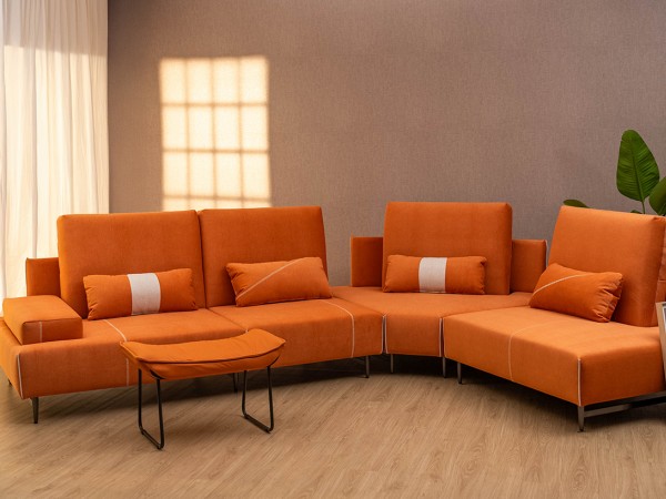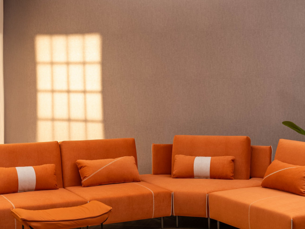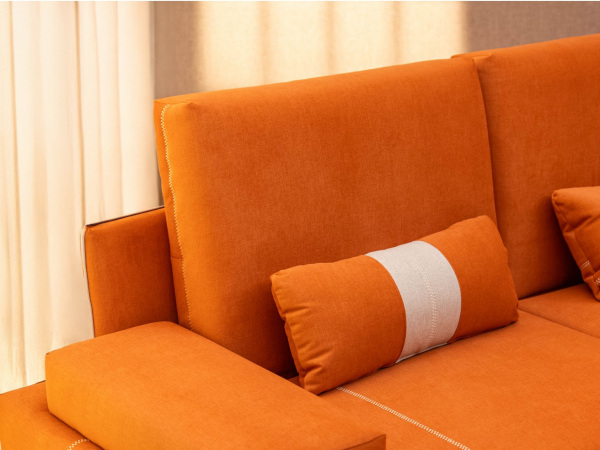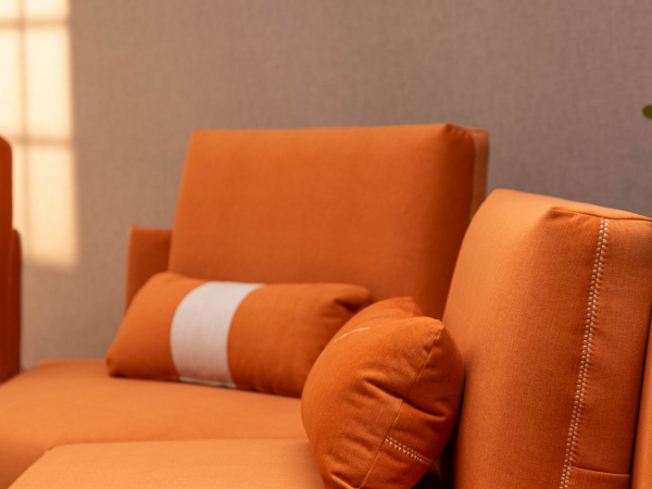 橘銅暖調搭配拼色抱枕,活潑卻不張揚,完美平衡設計感與舒適度。