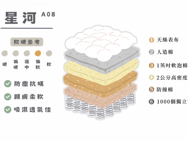 星河 A08 採用六層用心結構,打造柔軟包覆 × 穩定支撐的睡眠體驗,適合喜愛舒適感又不失彈性的使用者。