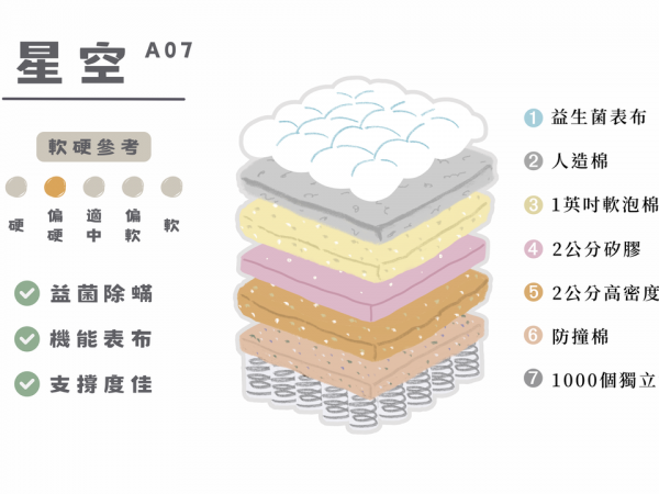 星空 A07 採用七層高效結構,兼具健康防護與結構支撐,是一張偏硬型床墊,適合講究支撐力與睡眠衛生的人群。