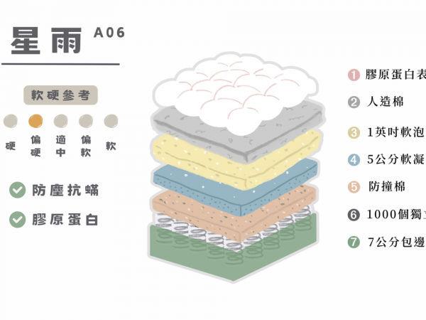星雨 A06 採用七層舒壓結構,強調彈性與支撐的平衡,屬於偏硬型床墊,適合追求穩定支撐又希望保有柔軟包覆感的使用者。